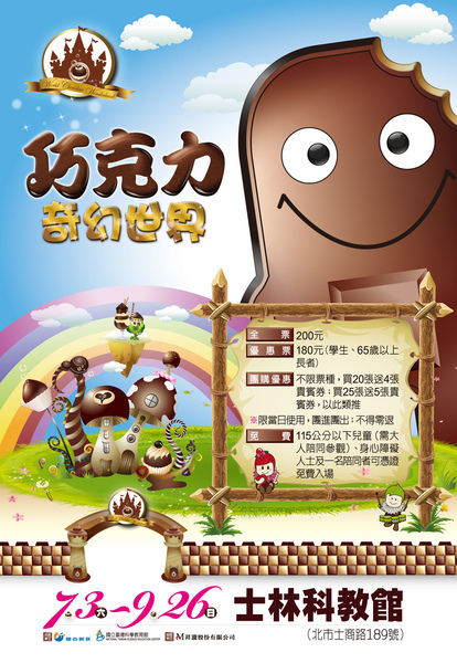 「巧克力奇幻世界」特展從99年7月3日至99年9月26日止,在士林國立臺灣科學教育館七樓展出;全票200元,優惠票180元,DIY體驗票每張100元,